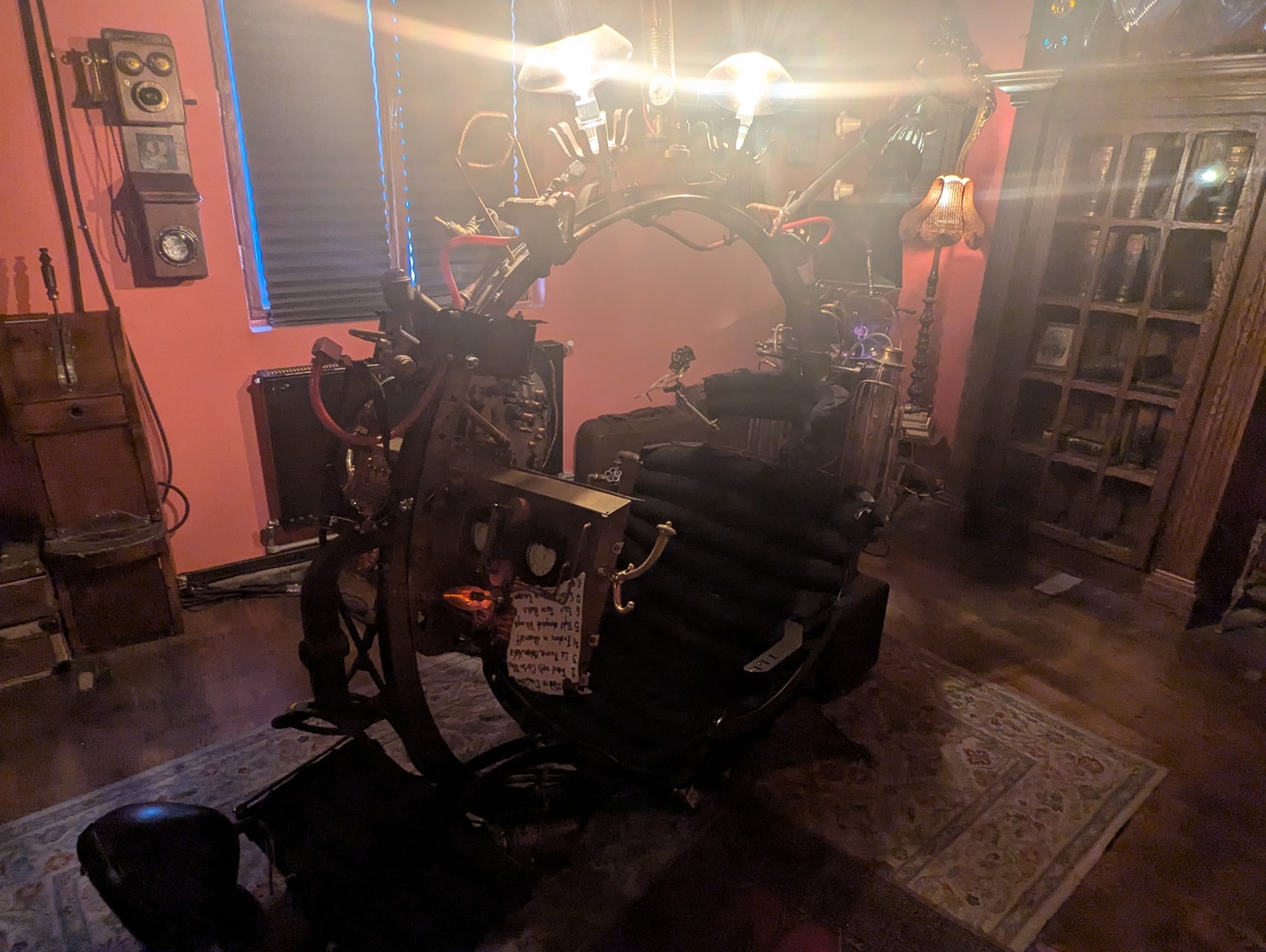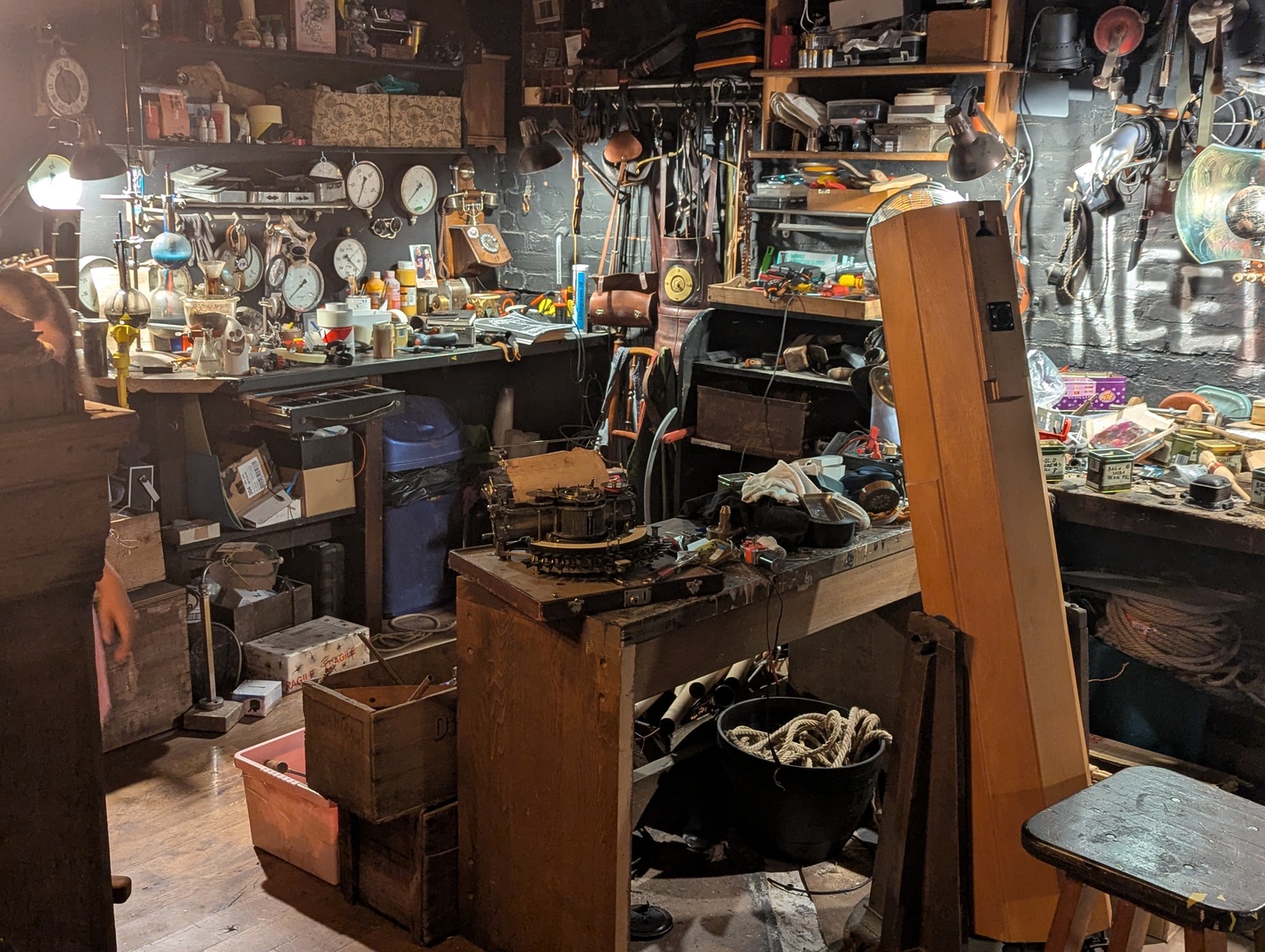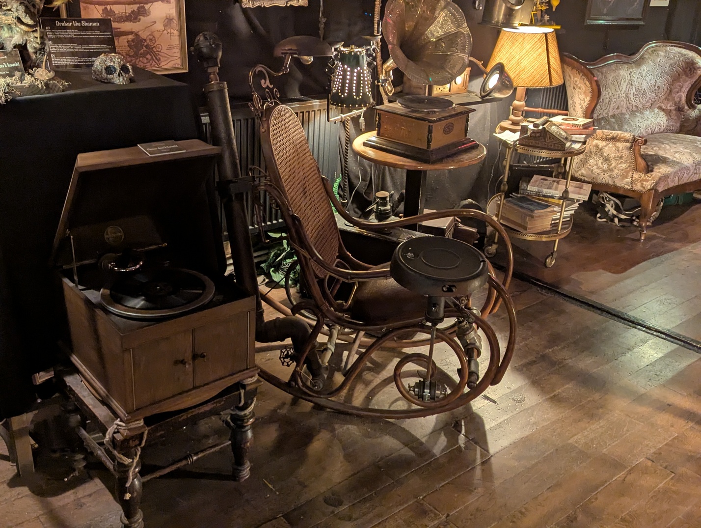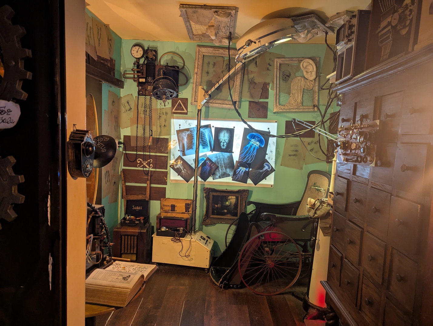 Cages, guitares, consoles de jeux vidéo, vélos, baignoires, tuyaux en tous genres, lampes… La diversité des sources stimule l’imagination avec ces inventions surprenantes et ces assemblages foisonnants, tous détournés de leur apparence ordinaire. Le savoir, l’érudition et la gentillesse des guides, dotés d’un humour certain, accompagnent une visite déroutante qui inclut même un voyage dans le temps, installé dans un siège dissimulé derrière une bibliothèque très bien fournie.