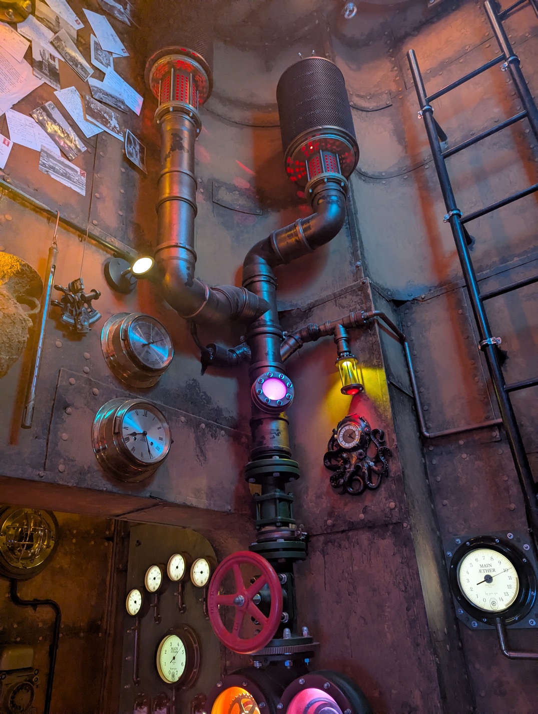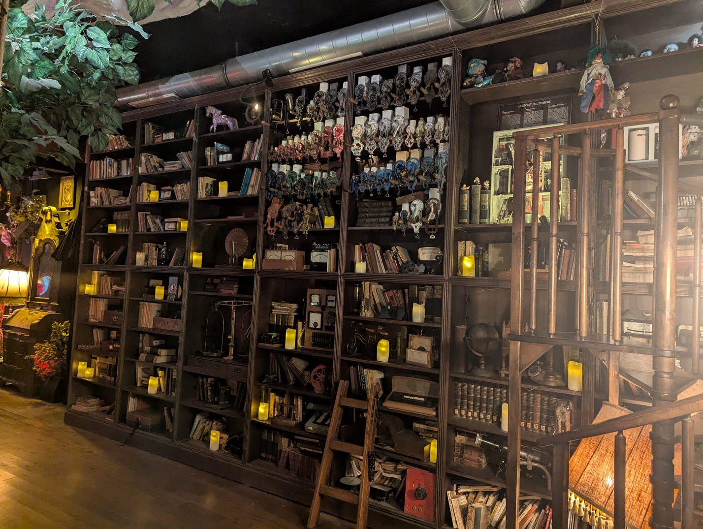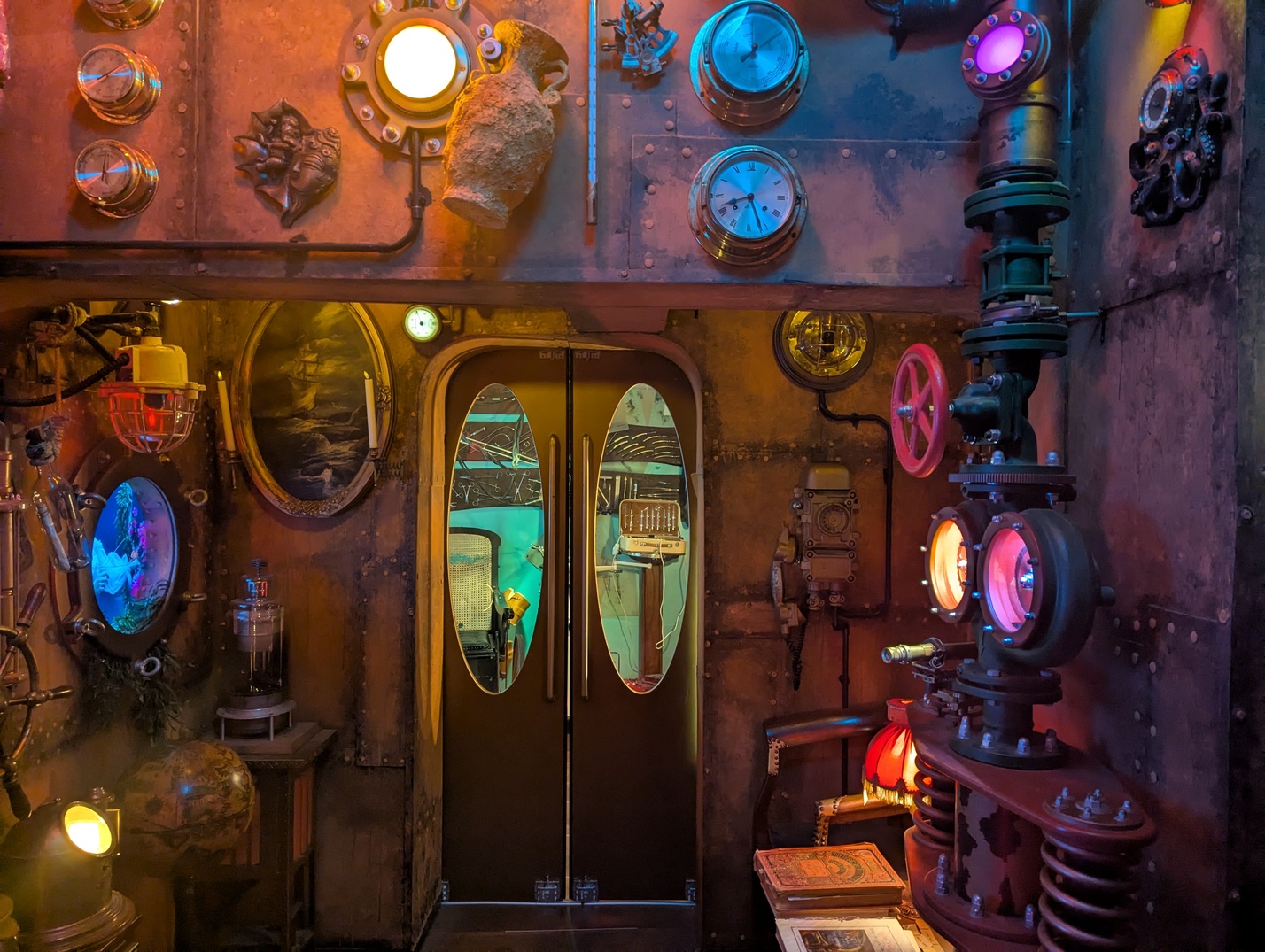 Cages, guitares, consoles de jeux vidéo, vélos, baignoires, tuyaux en tous genres, lampes… La diversité des sources stimule l’imagination avec ces inventions surprenantes et ces assemblages foisonnants, tous détournés de leur apparence ordinaire. Le savoir, l’érudition et la gentillesse des guides, dotés d’un humour certain, accompagnent une visite déroutante qui inclut même un voyage dans le temps, installé dans un siège dissimulé derrière une bibliothèque très bien fournie.
